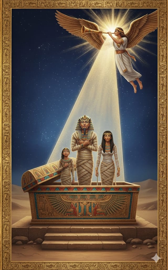 The undeniable call to awaken or transform, coming from above or within. Represents the emergence of the higher self, intuition, or Spirit which cannot be silenced when it is time for rebirth.Mummified Figures Rising: