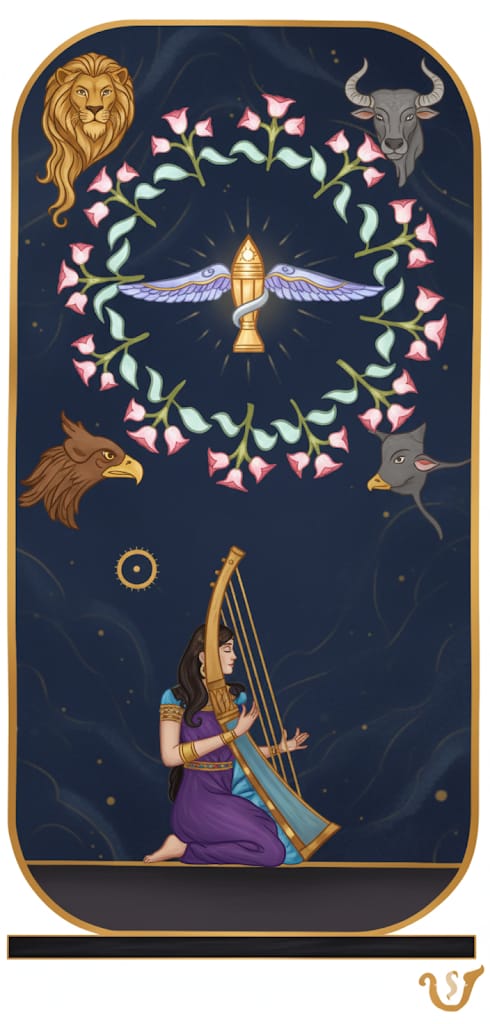 This figure in the card embodies Spirit living as a liberating, creative presence—expressing wisdom, play, and harmony not through striving but through genuine artistry. The musician represents the soul’s journey culminating in joyful participation and the sharing of gifts with the world.Circle of Vines or Laurel Wreath: